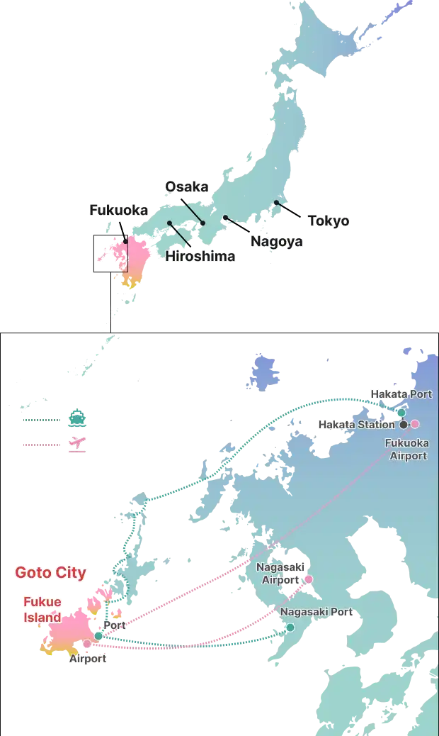 1. Fukuoka Airport β†’ Goto Fukue Airport: about 40 min (by plane)